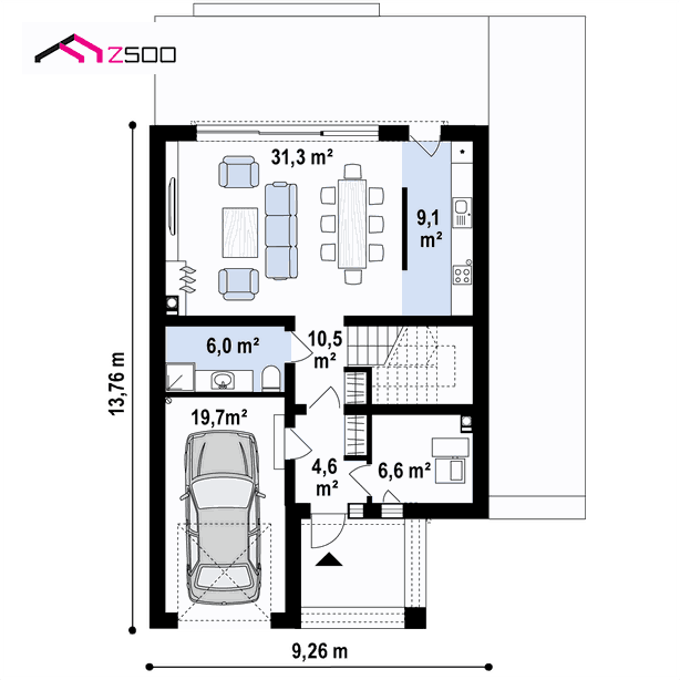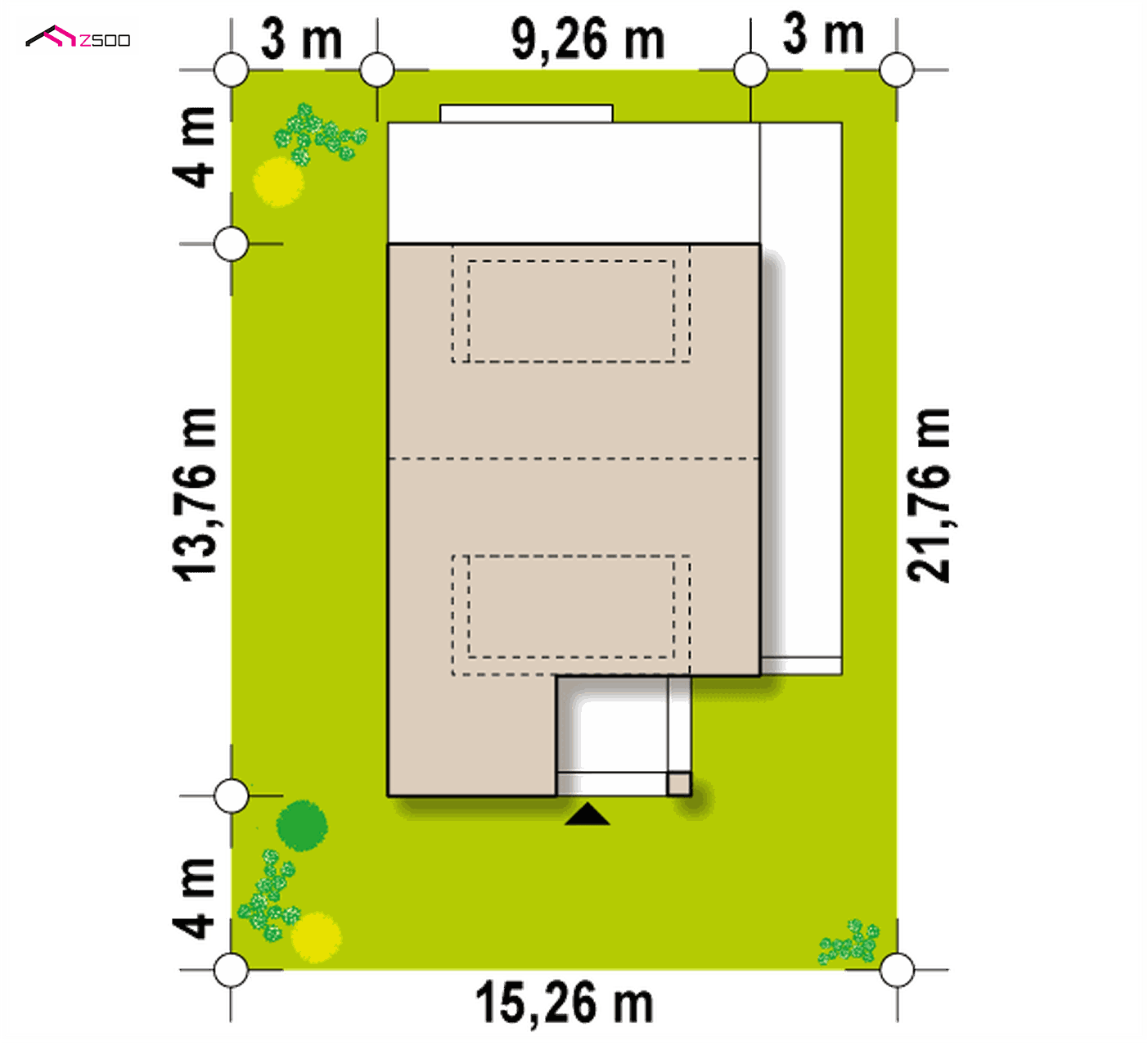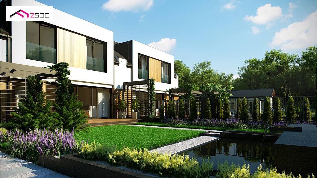 Zb21Casa adosada tradicional con cubierta a dos aguas, diseño de una forma moderna con garaje para un solo coche. También se puede construir como una casa pareada. Los elementos decorativos son: pérgolas, y porcelanico que imitan madera en la fachada. Dos grandes buhardillas son característicos en este diseño. En el umbral, nos recibe una entrada techada a la sala, que es el enlace entre el garaje y el cuarto técnico para una caldera. En el centro de la zona diaria tenemos un espacioso salón con cocina. Las escaleras ubicadas en el centro de la casa conducen a la prmera planta, donde el arquitecto diseñó 3 dormitorios, uno de los cuales está equipado con un baño individual y vestidor. Las personas que viven en las otras dos habitaciones usan el baño compartido al final del pasillo. Estas habitaciones tienen un espacio para un armario abierto y salida al balcón. La mayor atracción del diseño es sin duda la chimenea externa en la glorieta y el estanque integrado en la arquitectura del jardín. Gracias a ellos pasaremos momentos agradables con nuestros amigos y familiares.