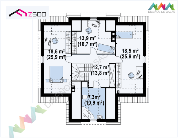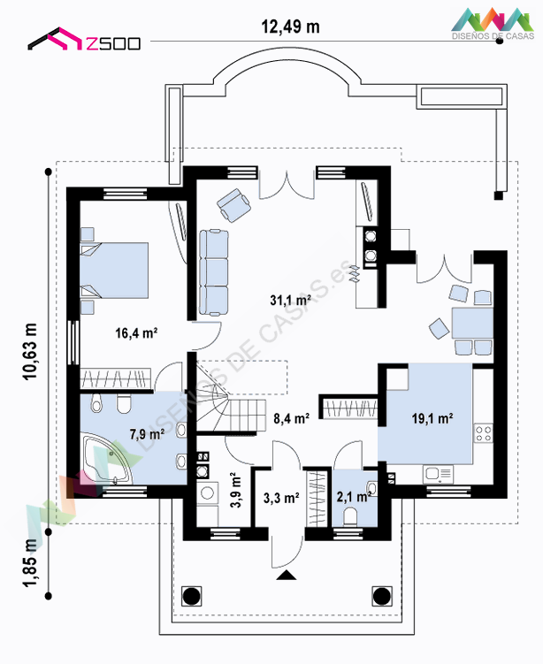 Modelo Casa Besaya Z9 esta diseñado para parcela pequeña. La casa fue diseñada de una manera que se refiere al estilo señorial, que se caracteriza por una entrada central en un tímpano sostenido por columnas, colores tenues, detalles decorativos, cornisas. El cuerpo simétrico y compacto está cubierto con una cubierta a dos aguas, lo que simplifica la implementación.