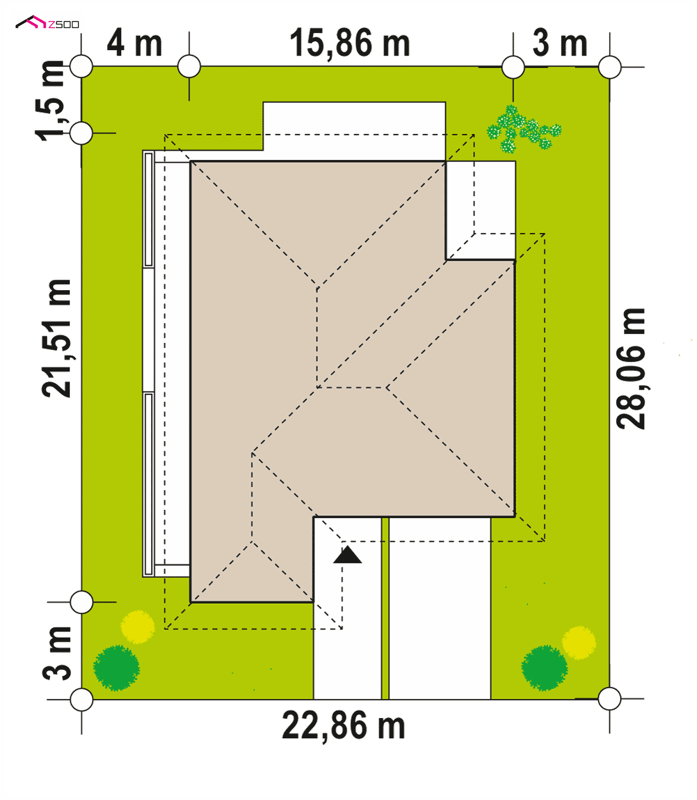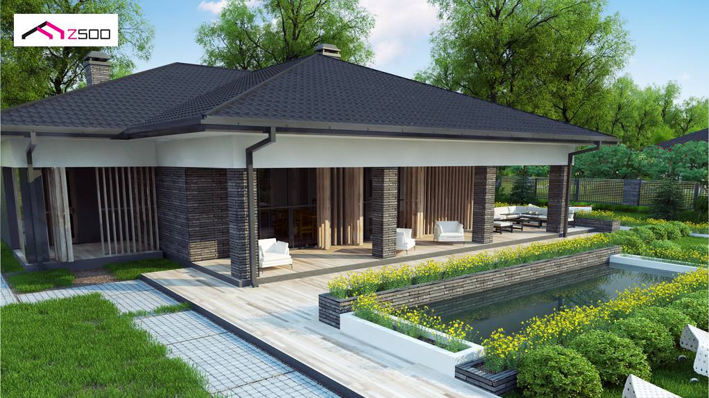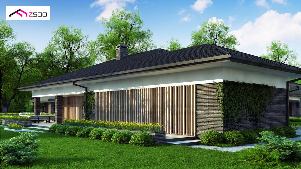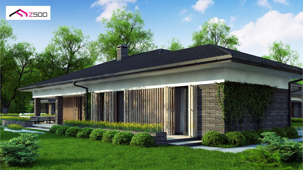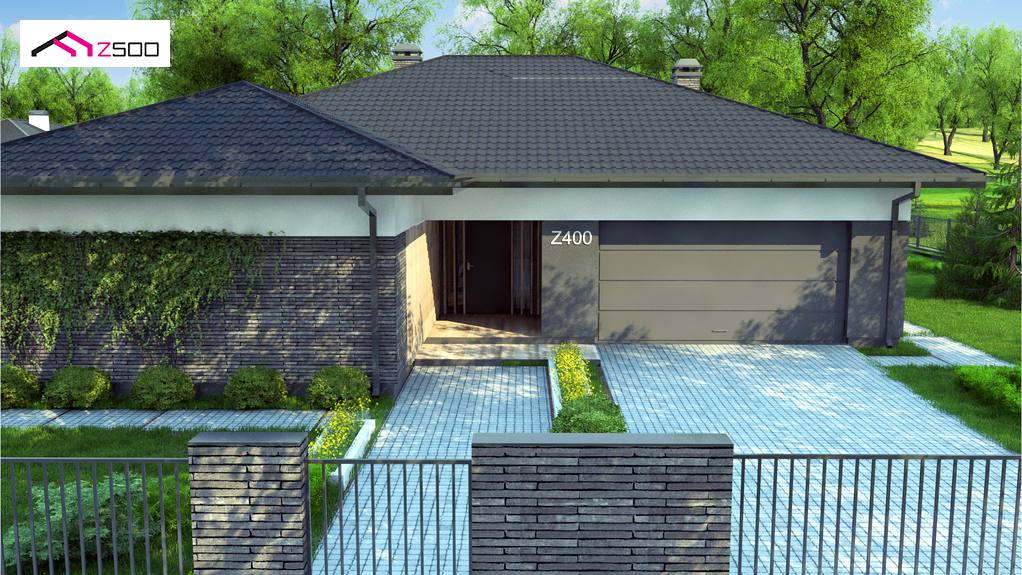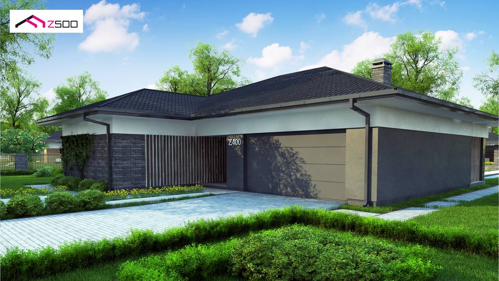Z400 es un diseño de casa moderna de una planta con un garaje para dos coches. Los colores de la fachada fueron elegidos en tonos de tenuos y elegantes – gris y grafito.