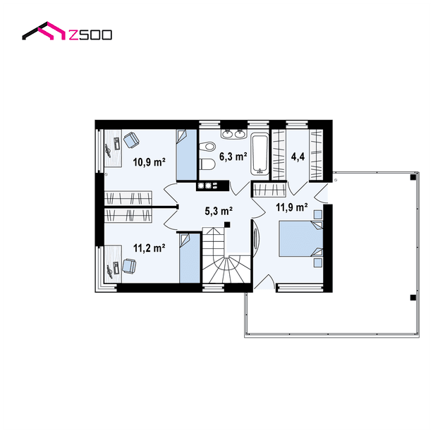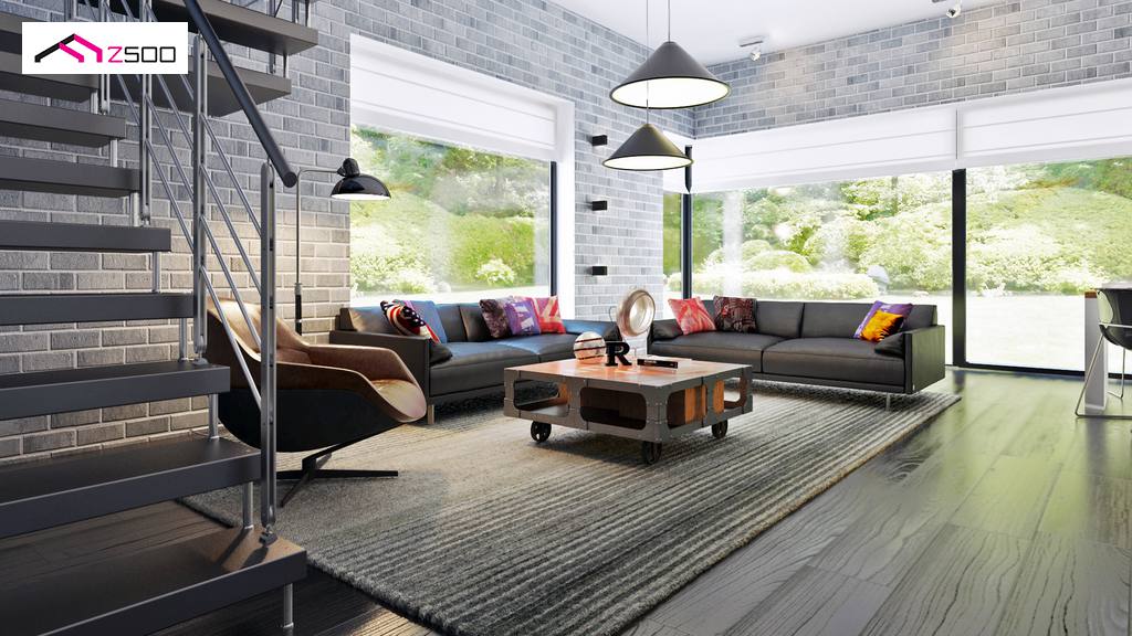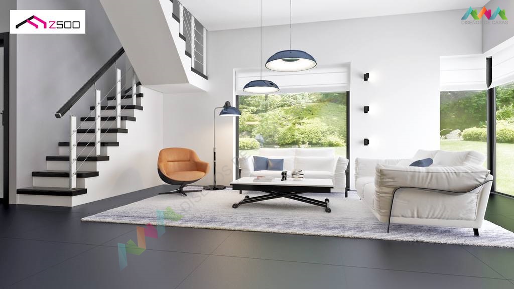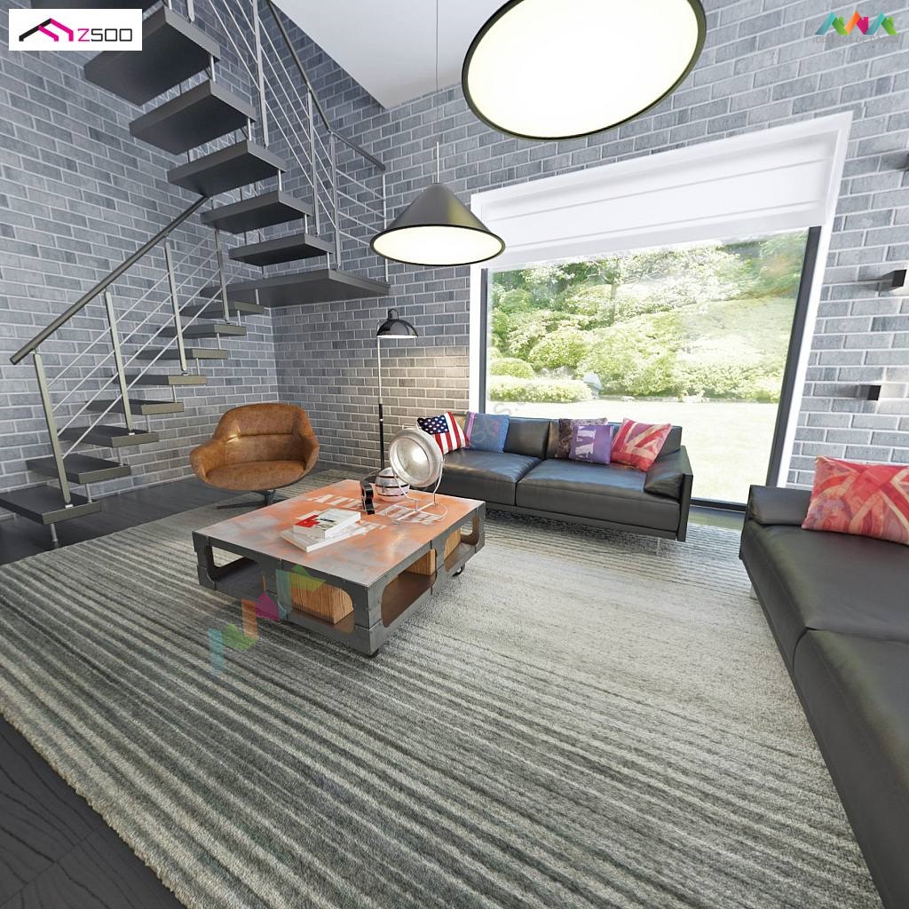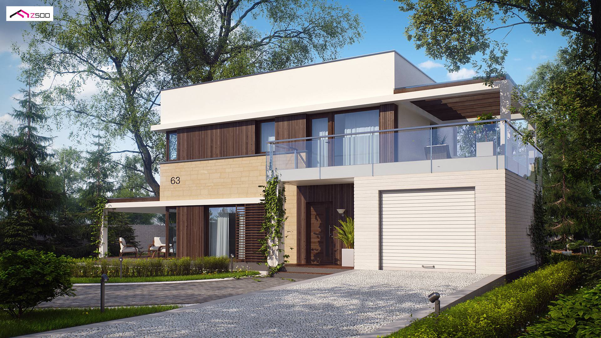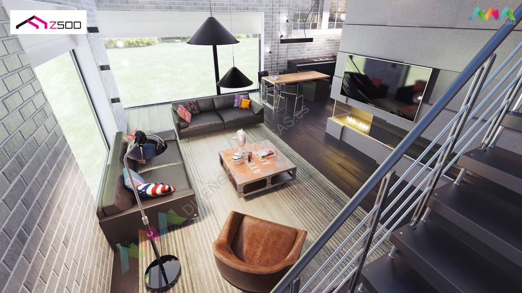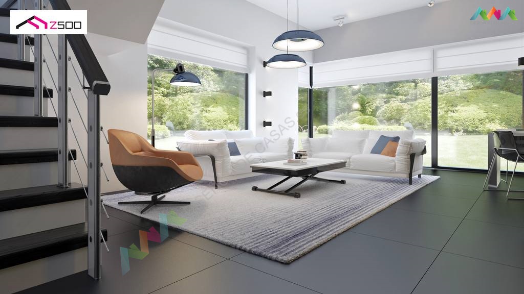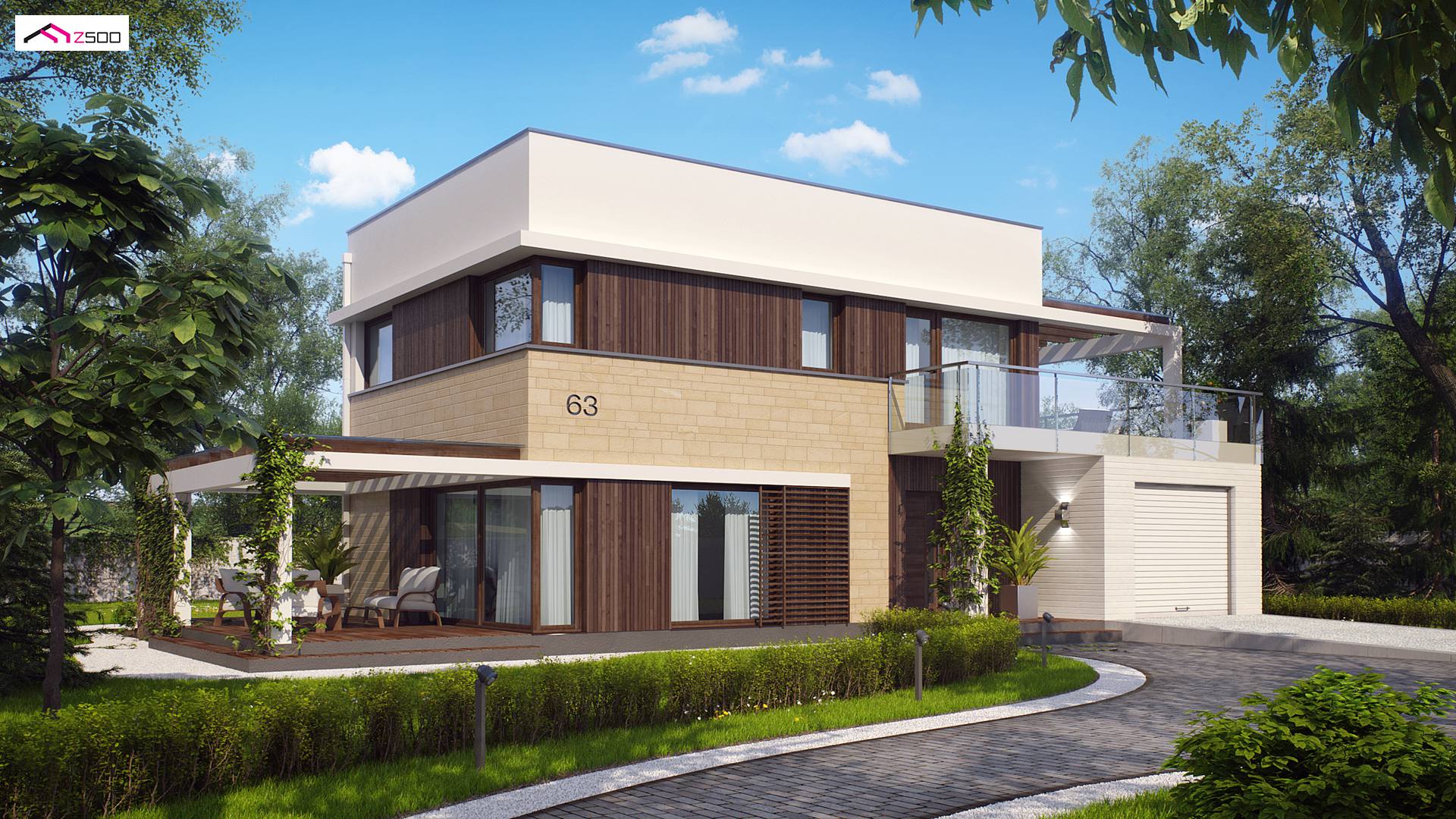 Zx63 es una casa moderna de diseño óptimo con un garaje. La sala de estar junto a una amplia terraza cubierta con una pérgola de madera, se encuentra en la parte delantera (sur), la cocina tiene ventanas con vistas al jardín. El salón combinado con la cocina y el comedor crea un espacio abierto, bien iluminado con acristalamiento (ventanas) hasta el suelo. Al lado de la cocina está disponible una gran despensa. La chimenea se encuentra en el corazón de la casa: se puede admirar el fuego desde el comedor y desde el sofá de la sala de estar. En la planta baja hay una habitación adicional con ventana al jardín que puede usarse como habitación de invitados, un estudio o dormitorio de los padres. Al lado de la habitación hay un baño con ducha.