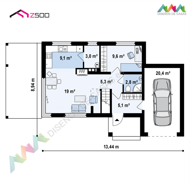 El garaje está conectado directamente a la casa a través de una sala común con espacio para un largo armario para ropa exterior. La casa en la versión básica tiene un garaje individual, con posibilidad de ampliación a dos plazas de coche.