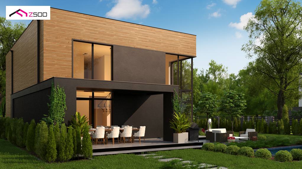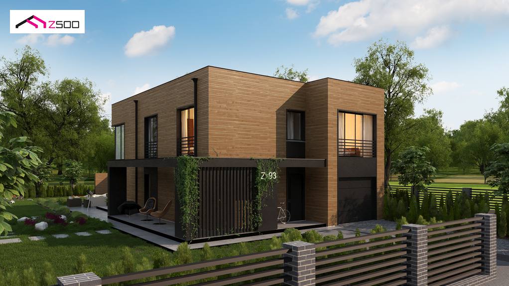 El diseño de casa moderna de dos plantas con cubierta plana y un garaje individual. La casa destaca principalmente por el acabado de su fachada para la que se utilizó una combinación de revestimiento de madera y yeso de grafito. La fachada oscura, simple y elegante llama la atención de todos los viandantes.