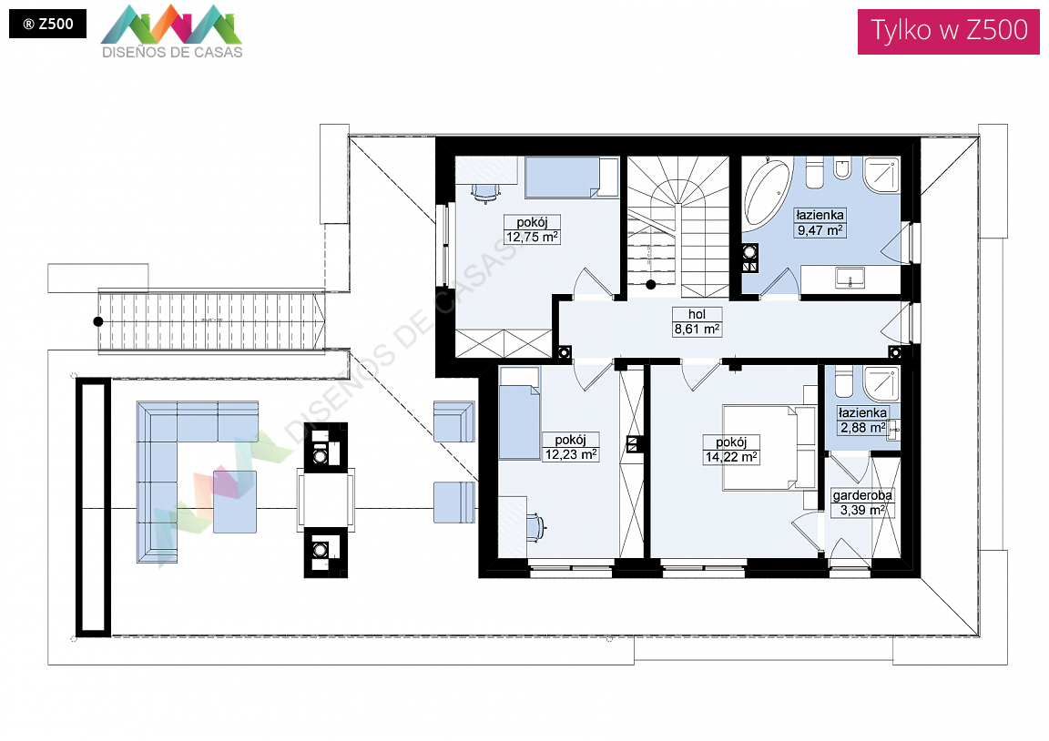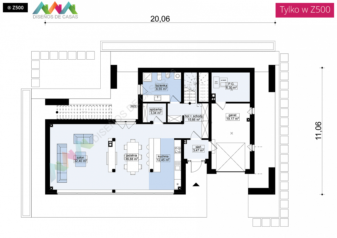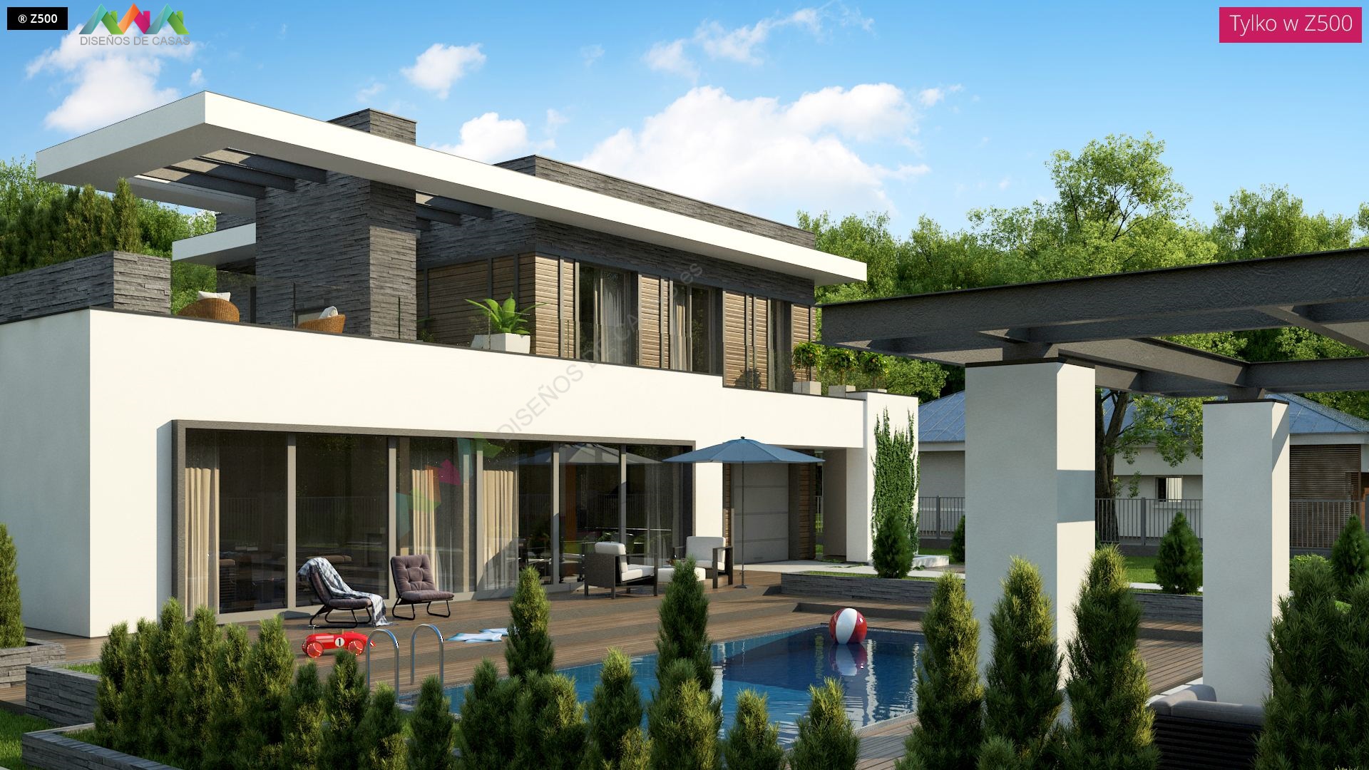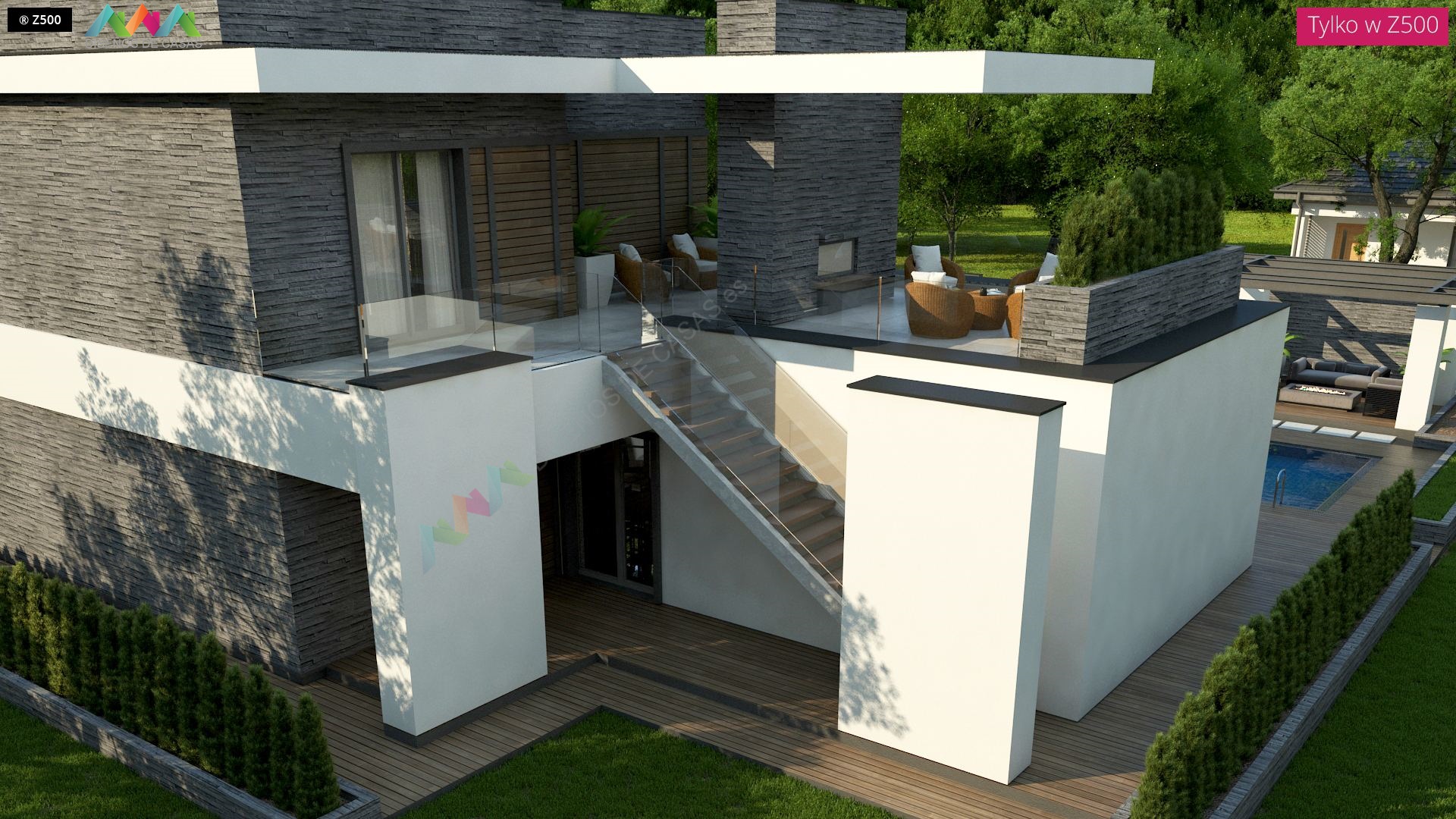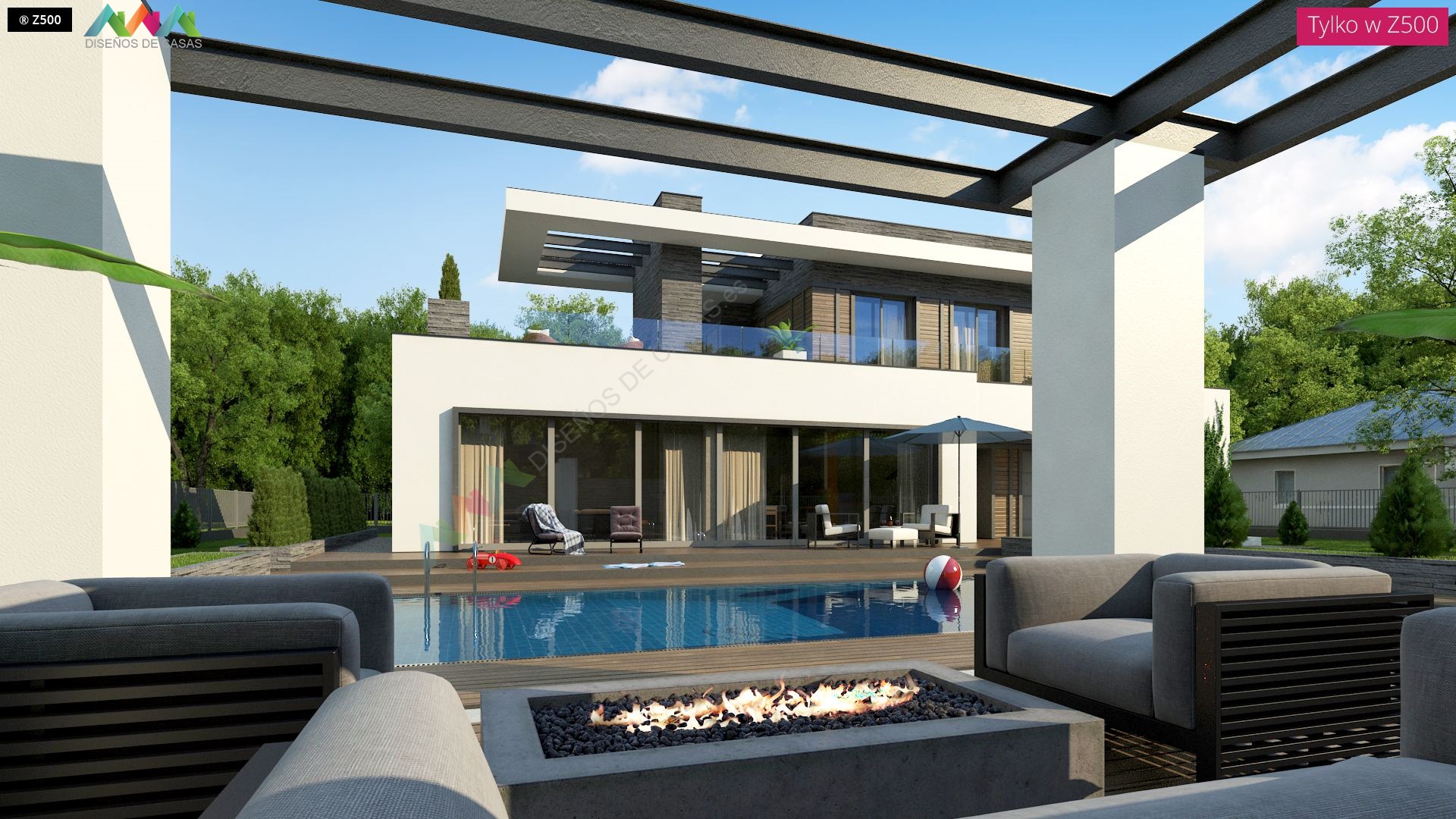 Para los amantes de arquitecura moderna presentamos el proyecto de Casa Zaragoza zx146. En la fachada se ha utilizado yeso blanco que contrasta con piedra y madera o imitación de madera en porcelanico. La vivenda unifamiliar presenta simples formas que se abrenal jardín. Una casa ideal para pasar tiempo en familia: la sala de estar se coloca desde el frente. Está junto al comedor abierto con ventanas panorámicas y una cocina amplía. El salón destaca por una chimenea acogedora, que se puede disfrutar tanto desde la sala de estar como desde el comedor. Otra chimenea fue diseñada en la terraza para disfrutar de noches al aire libre. La sala de estar tiene mucho espacio para colocar sofás cómodos. Una de las paredes en la cocina no incluye ventanas que permite construir armarios altos desde el suelo hasta el techo. Gracias a este tipo de solución, todos los objetos encontrarán un lugar apropiado. La isla de la cocina es grande y forma parte de un punto de reunión de la casa. Al lado encontraremos despensa para colocar congelador, latas, botellas y otros electrodomesticos. En la primera planta se encuentran tres cómodas habitaciones y dos baños. El dormitorio principal tiene su propio baño y vestidor. A la terraza grande de la primera planta se puede acceder desde cualquier dormitorio, también desde el vestíbulo o baño e incluso desde la parte inferior subiendo la escalera.
