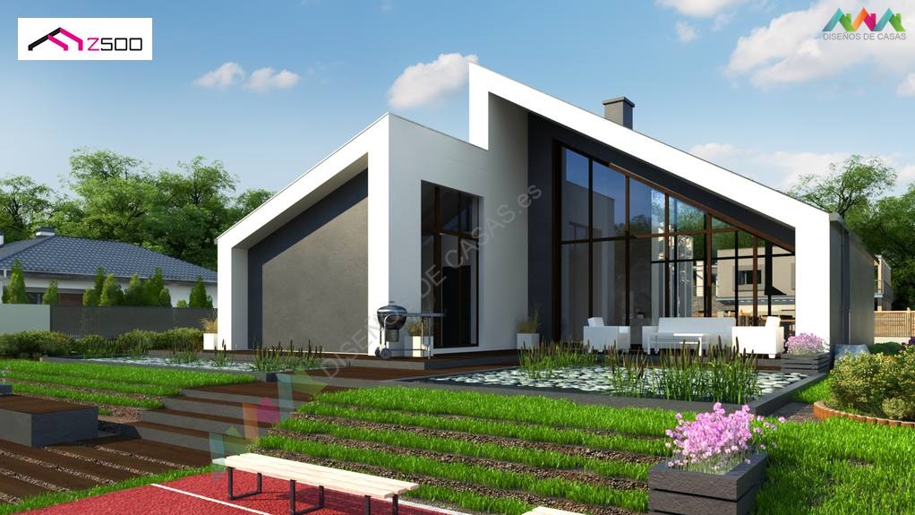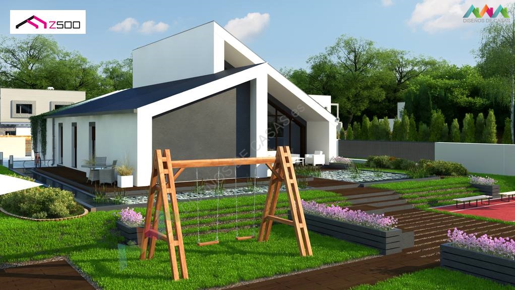 Es notable que, a pesar del área pequeña, en la casa Zx201 es posible usar un entrepiso en todas las habitaciones, gracias a lo cual obtenemos espacio adicional. Otra ventaja de la casa es la posibilidad de agregar un garaje desde la fachada frontal y lateral. Se propuso un refugio en las visualizaciones. También vale la pena mencionar que la casa puede ser pareada por el lado de la pared ubicada en la sala de estar que linda con el jardin.
