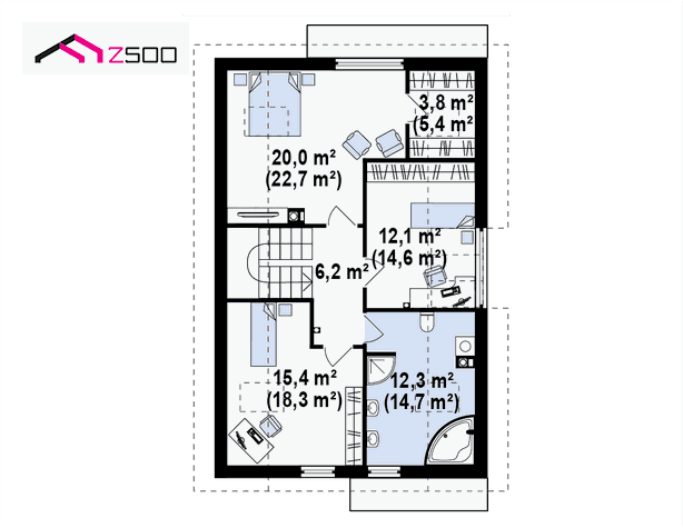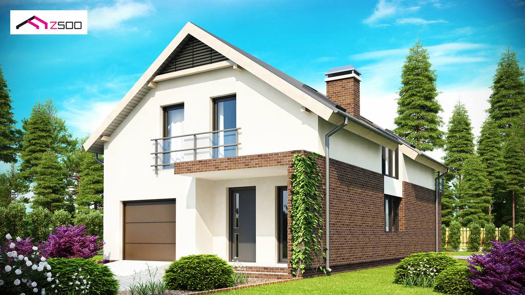 Z154 Casa de proyección longitudinal con garaje y cubierta a dos aguas. El diseño se distingue por una interesante fachada en color blanco, parcialmente revestida con ladrillo. Vivienda unifamiliar de formas simples y proporcionadas, con unas dimensiones ideales para poder emplazarla en una parcela estrecha, la convierten en una inversión económica y práctica para cualquier familia.